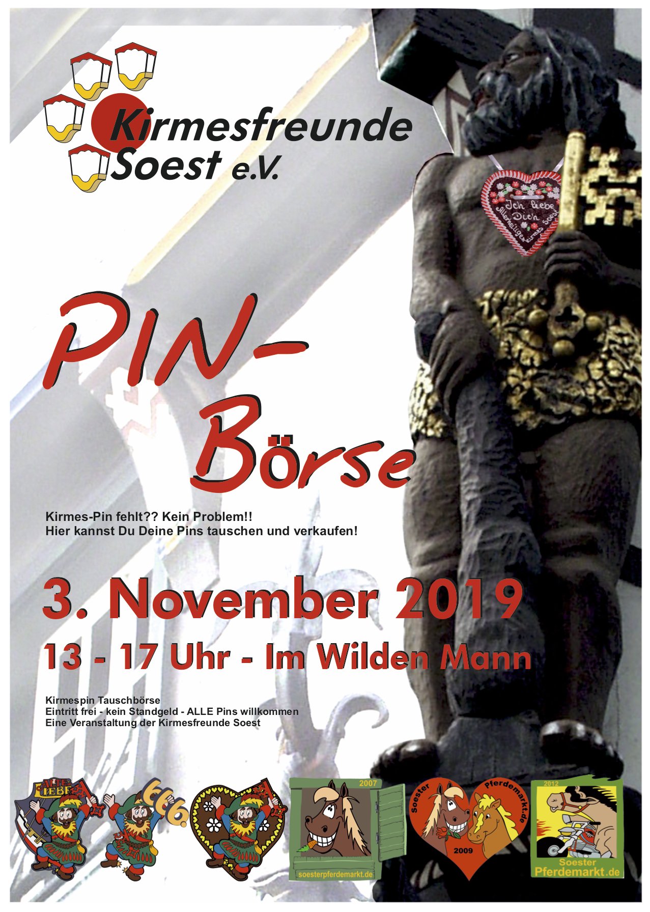 In diesem Jahr findet wieder die Pin-Tauschbörse der Kirmesfreunde Soest statt. Am Sonntag, dem 03.11.19 können wieder Pins getauscht und gekauft werden. In der Zeit von 13:00 – 17:00 steht der Hansesaal in der Gaststätte „Im wilden Mann“ für Fans und Interessenten bereit.