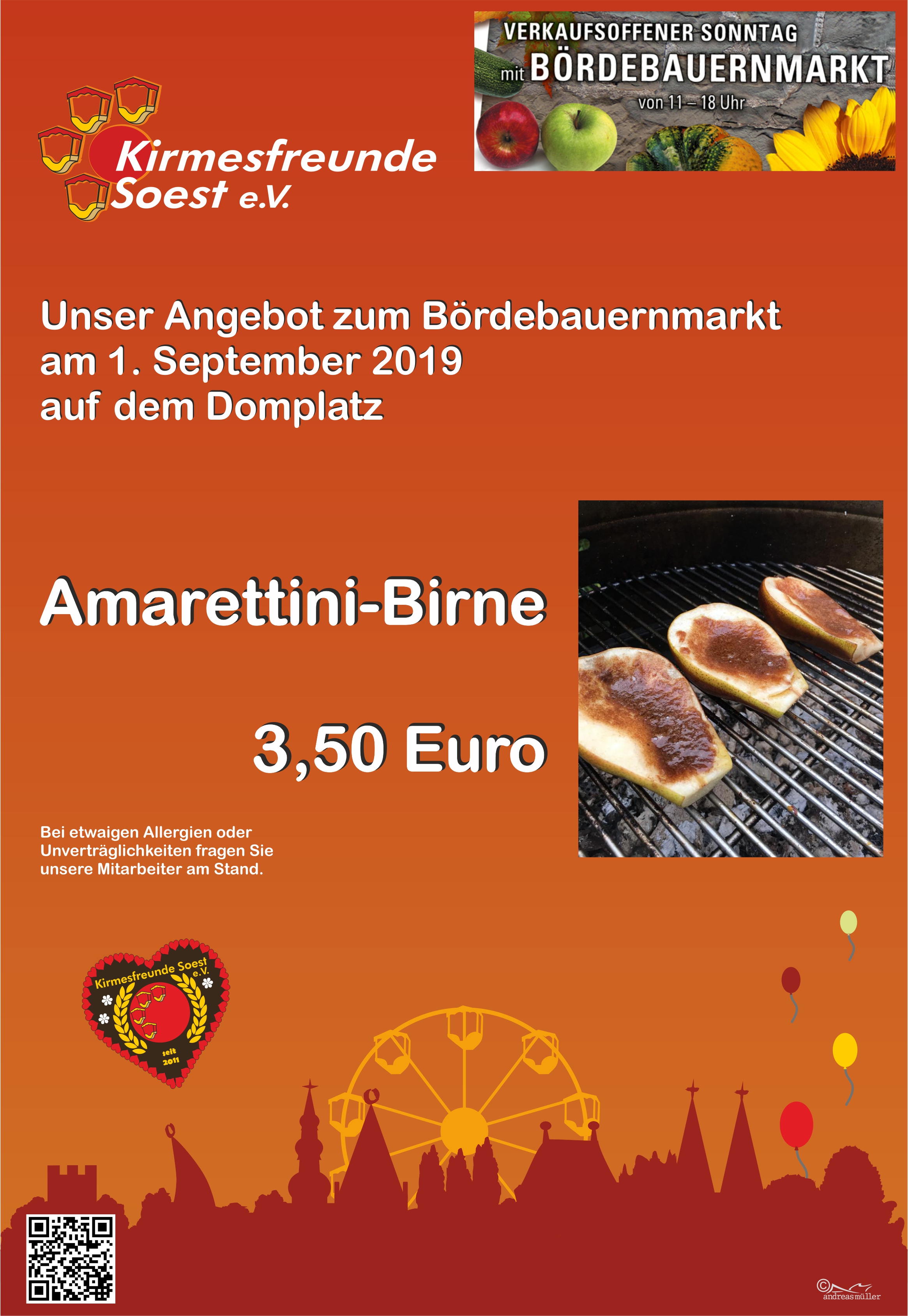 Am Sonntag, 01. September 2019 werden die Kirmesfreunde in der Zeit von 11 bis 18 Uhr mit unserem „historischen Kassenhäuschen“ auf dem Bördebauernmarkt vor dem St.-Patrokli-Dom (Seiteneingang Domplatz) eine „süße Köstlichkeit“ zum Verzehr anbieten. Wir werden eine vor Ort gebackene „Amarettini-Birne“ in einer essbaren Waffel verkaufen. Die halbierte, ausgehöhlte Birne ist mit einer leckeren Amarettini-Zimt-Zucker-Butter-Mischung versehen.