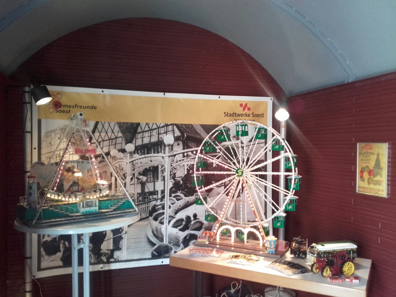 In einem Güterwagon wurden alte Filme und Fotos von der Allerheiligenkirmes gezeigt. Der Wagon war bestückt mit alten Kirmesplakaten, Kirmesmodellen und einem Motorrad von einem Kinderkarussell.